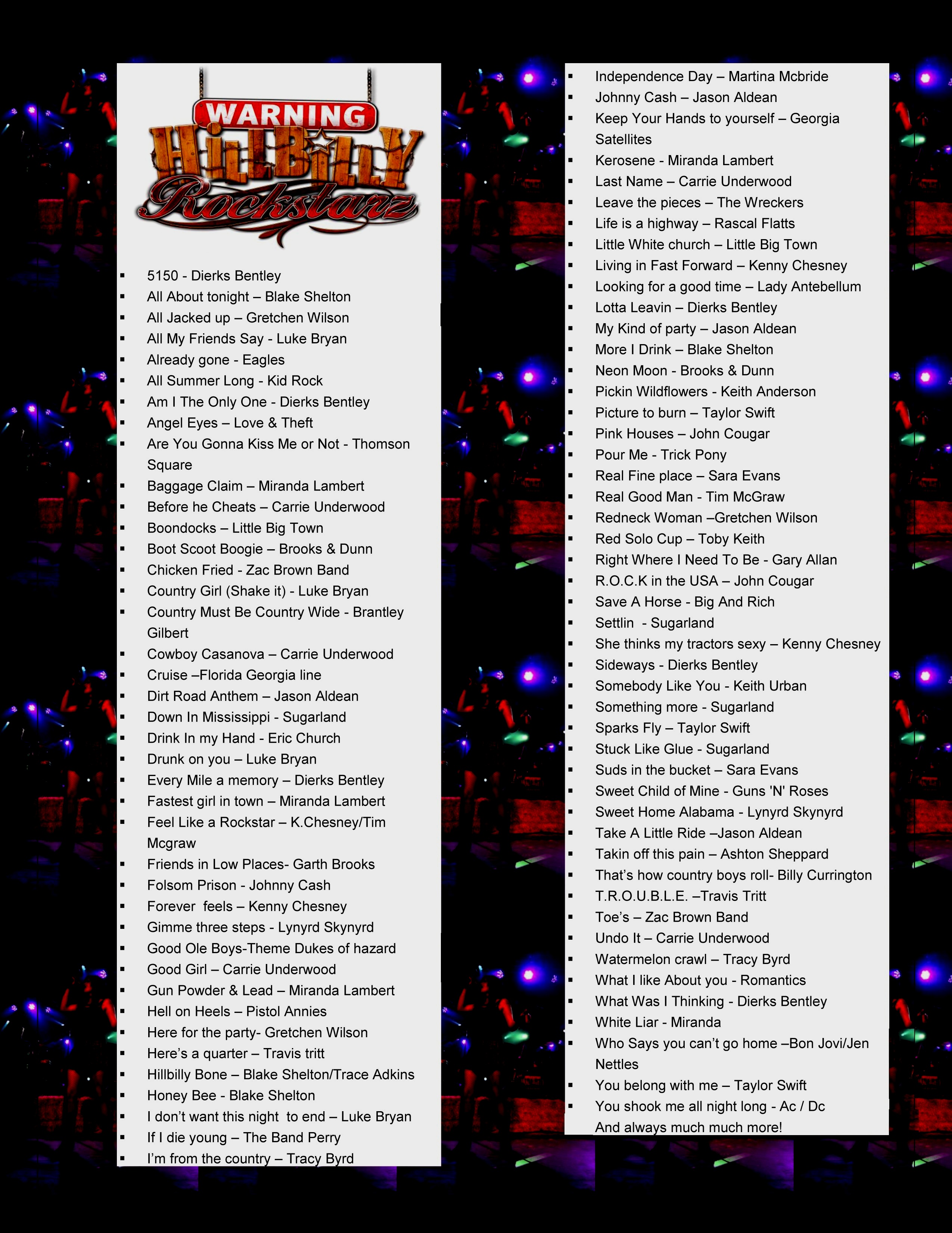 Chicago's #1 Country Band #1 for Fun that is...just ask the fans. The group is made up of chicagoland's most dynamic musicians, all with diverse and multi-talented backgrounds. They specialize in covering the latest hits in country music, and some of your older favorites, always true to the original, simply put this bands got you covered These players have one thing in common, the desire to play great radio friendly country music.Country Music fans will love the connection they have with the audience. Every show is guaranteed good time's... Hillbilly style! When you see Hillbillyz live, it's obvious that they're having fun up there, and that fun is contagious. Always mixing it up. One minute, jammin' some Little big town then Miranda Lambert, Kenny Chesney, Billy Currington,Carrie Underwood, Lady Antebellum, Jason Aldean and yes... even Rascal Flatts, next they will hit you with some Keith Urban, Luke Bryan and Gretchen Wilson. HBRS's versatility is their specialty, with these amazing and talented musicians you can't lose. Not only do they cover some of the best country songs heard on radio today, they also mix in cool, rock tunes as well, satisfying everyones tastes.