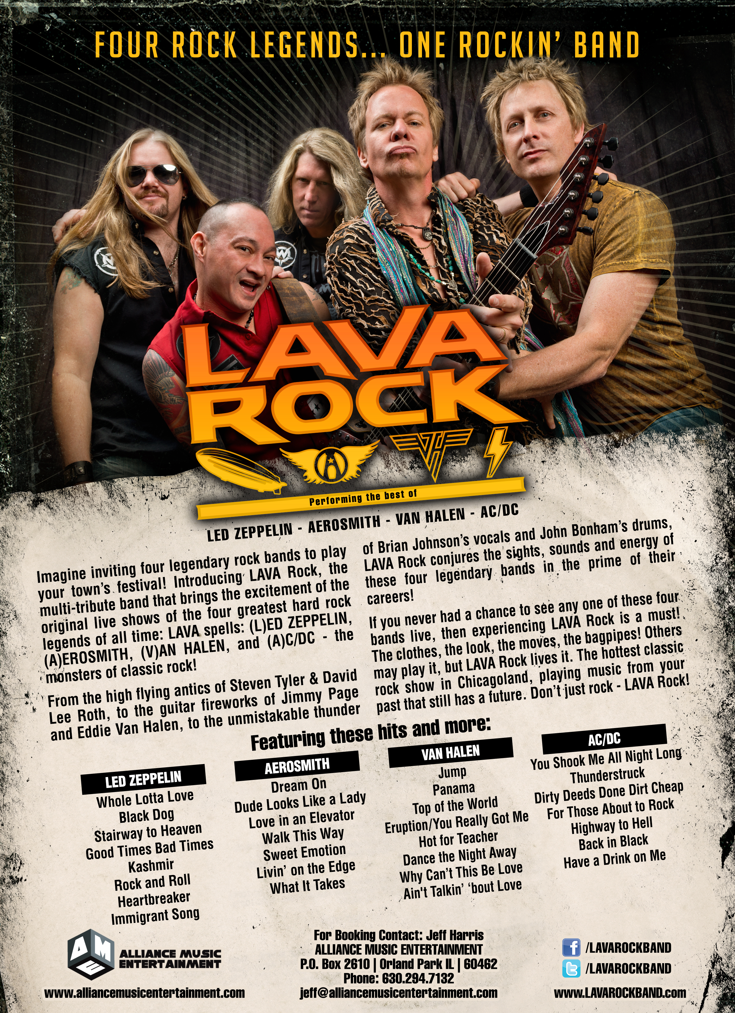 Imagine inviting four legendary rock bands to play your town's festival! Introducing LAVA Rock, the multi-tribute band that brings the excitement of the original live shows of the four greatest hard rock legends of all time: LAVA spells: (L)ED ZEPPELIN, (A)EROSMITH, (V)AN HALEN, and (A)C/DC- the monsters of classic rock!